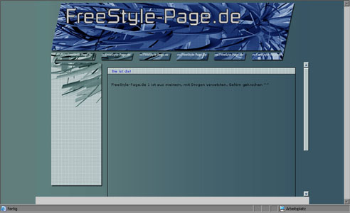 | Ja mein erstes FreeStyle-Design, der Header ist ein wenig zu groß geraten und der ganze Hintergrund passt irgendwie nicht da rein, obwohl dadurch das gesamte LayOutin Grün-Blau gehalten ist. Der Hintergrund ist mit Cinema4D gemacht und der Rest mit Photoshop. |