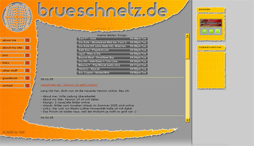 | Version 15 existierte von Dezember 2005 bis Mitte Mai 2006. Eine relativ dunkle, geschwungene, aber natürlich orange Gestaltung war meine Inspiration dafür. Ohne große inhaltliche Änderung zur Vorgängerversion, war DAS Highlight wohl das zugespamte Gästebuch mit über 1900 Werbeeinträgen in nur 3 Monaten. Da ich die Einträge nicht löschen konnte, wurde das Gästebuch vorübergehend deaktiviert. |