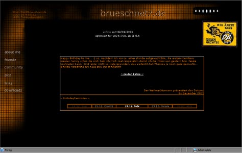 | Dies war Version 8.0 von brueschnetz.de. Die Seite war auf 1024 x 768 Pixel ausgelegt. Es war der Beginn meiner schwarz-orange Kombinationen :)... Das Design wurde wie alle meine folgenden Seiten mit Adobe Photoshop erstellt und hatte den legendären BirthdayReminder ^^ |