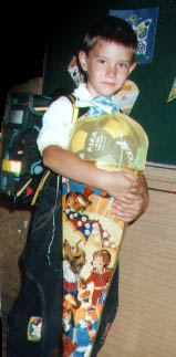 Dann kam die Wende und aufeinmal gab es kein Schwarz-Weiß mehr, sondern alles war bunt! Irgendwann im August 1990 wurde ich also in die Pettenkofer Grundschule in Berlin Friedrichshain eingeschult und verlebte dort herrliche Jahre. Die Schule war total einfach und jeden Tag hieß es Fussball spielen, Fahrrad fahren und auch sonst einfach nur SPIELEN (natürlich nur mit den Jungs, Mädchen waren uninteressant!). Irgendwann in dieser Zeit stand plötzlich ein schwarzer Kasten in unserem Wohnzimmer und nachdem mir meine Mutter erklärt hatte was das war, hatte ich einen neuen Spielgefährten, den Computer. Auf einmal kannte ich den Namen LucasArts® und spielte Adventures wie Indiana Jones oder Monkey Island, aber auch Spiele die meine Eltern nicht so sehr toll fanden waren auf dem heimischen PC zu finden, z.B. Wolfenstein 3D oder Duke Nukem 3D (diese Spiele werden auch jetzt nur einigen was sagen). Kurzgesagt, es ging um das abmetzeln von Aliens und Nazis mit tausend verschiedenen Waffen (und ich habe trotzdem nie an einen Amok-Lauf gedacht :). Zu meiner Einschulung entstand übrigens dieses tolle Foto von mir: |